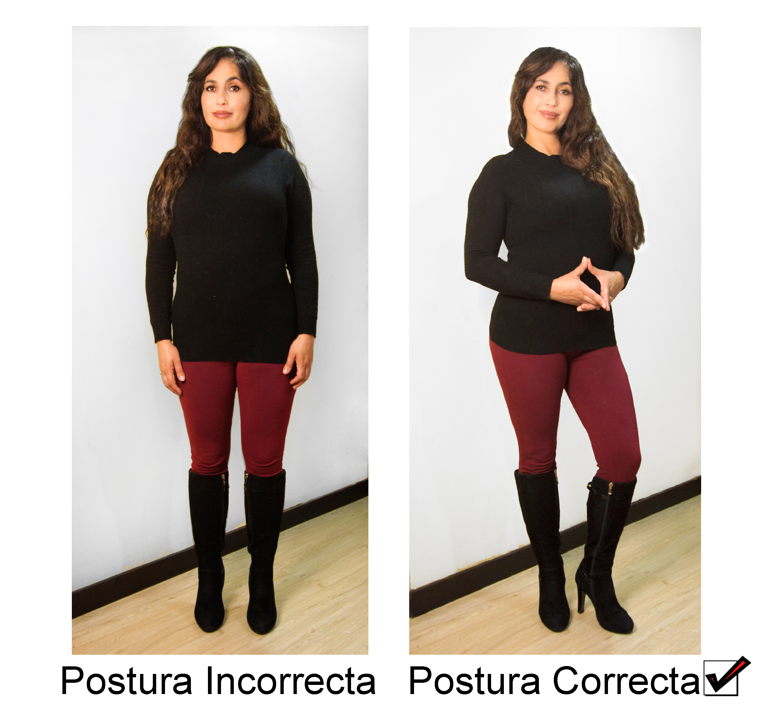 La postura nunca debe estar totalmente de frente a la cámara, es mejor estar de frente a la luz principal y que los ojos estén mirando hacia el lente de la cámara para lograr la posición denominada “tres cuartos”. De esta manera la figura se ve armoniosa, sin importar si el plano es general o medio. Si no estamos de pie, sentémonos en el borde de la silla para que la espalda se enderece.