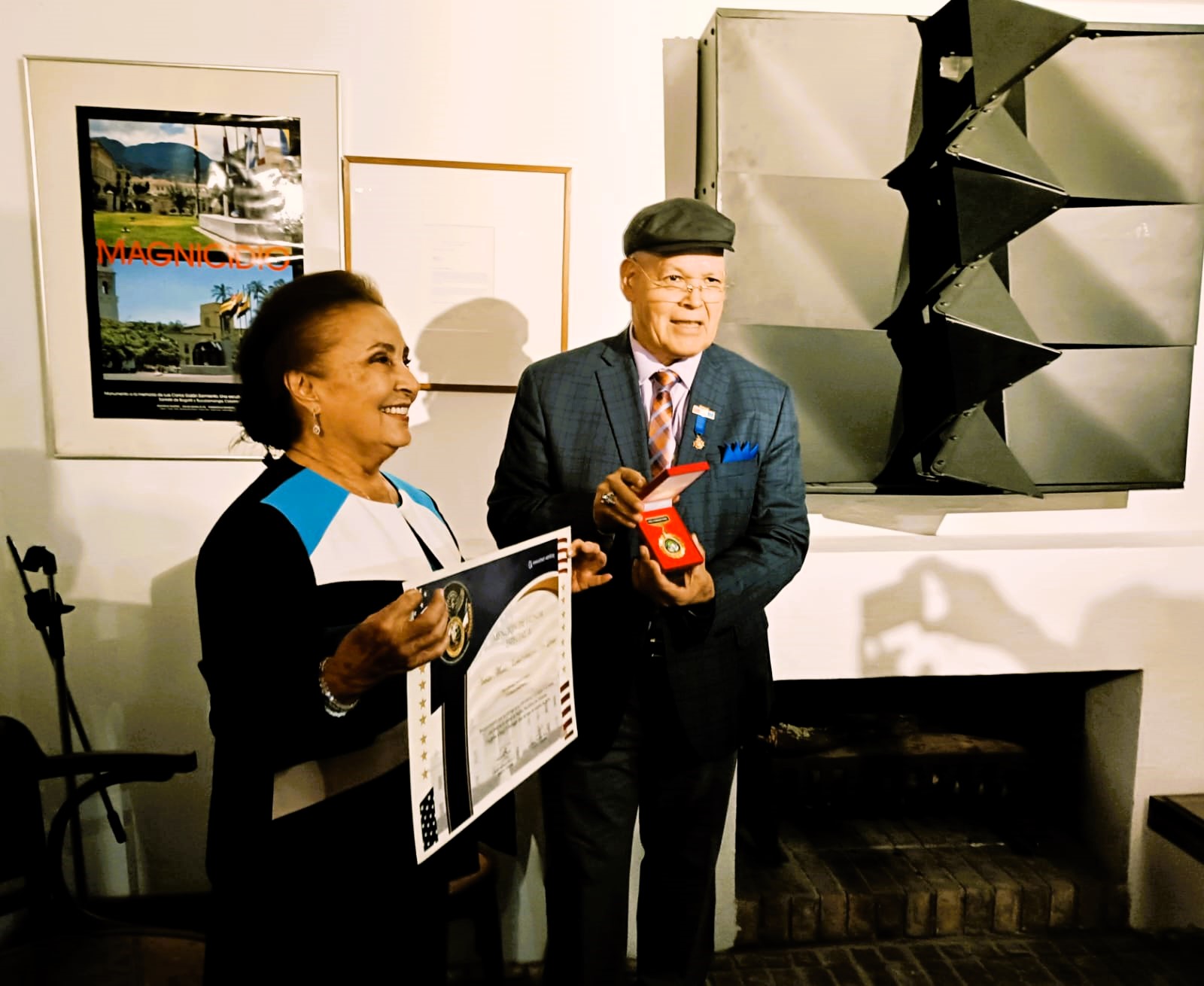 Antes de iniciar el coloquio, el Presidente de la Asociación Colombo Hispanoamericana Jesús Antonio Bravo, le entregó una medalla especial y un diploma honorífico como reconocimiento a una labor artística tan encomiable.