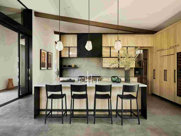 A pesar de su «capa exterior» protectora, la casa de 365 metros cuadrados se siente abierta y fluida. Sus líneas limpias abundan, con una gran sala con techo inclinado y vigas de madera a la vista, que crea una sensación de amplitud y grandeza. La cocina, moderna y cálida a la vez, está rodeada por una gran isla, perfecta para recibir invitados. Conectadas por un pasillo al aire libre, todas las habitaciones se encuentran en un ala separada de la casa, lo que ofrece privacidad y tranquilidad. La casita de la piscina, la cochera y la terraza cubierta suman 65 metros cuadrados adicionales.