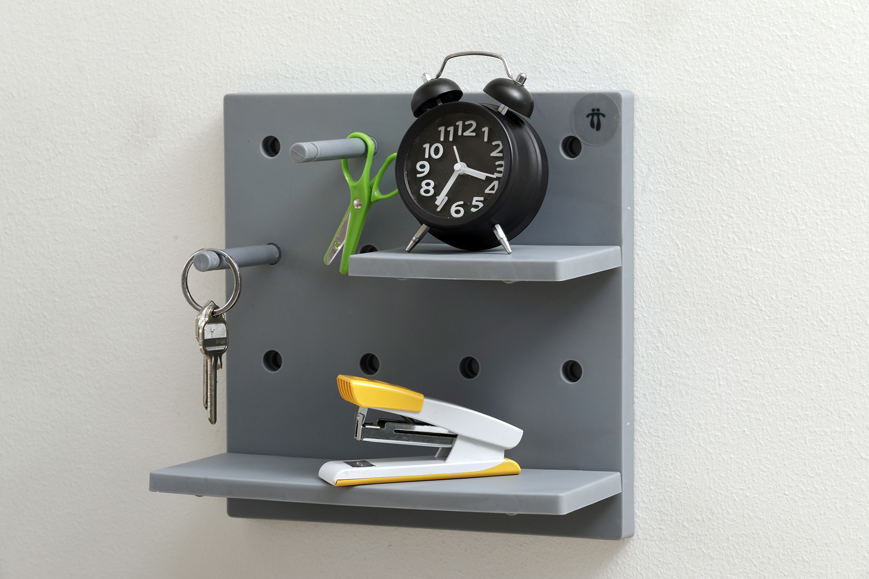 - Tablero organizador que cuenta con 2 repisas (grande y pequeña) y seis soportes para que se pueda organizar las cosas que más necesiten, se ajusta a cualquier superficie gracias a sus cuatro adhesivos en la parte posterior. Si se requiere se puede unir varios tableros para armar uno más grande y personalizarlo de acuerdo a las necesidades. Es ideal para sala, habitación, cocina, baño o cualquier lugar de la casa en el que se considere necesario.