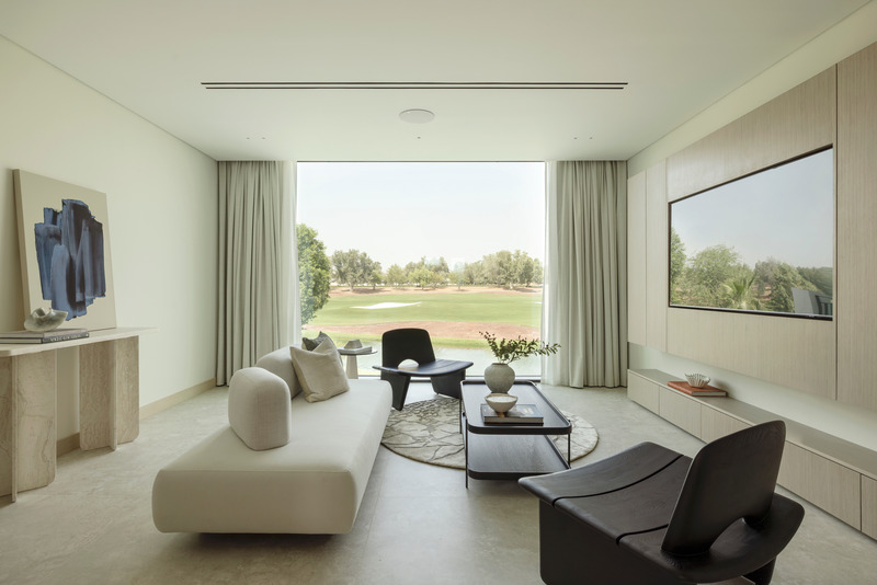 Desde el principio, el concepto de diseño se basó en la sobriedad. Inspirada en las texturas tonales del paisaje natural de Dubái, la paleta de colores se nutre del suave travertino, las maderas naturales y las cálidas piedras neutras. La materialidad es táctil pero discreta; las formas son expresivas pero mesuradas. Es una casa que transmite con suavidad y con intención.