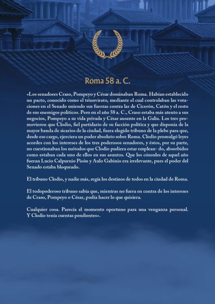 En el año 58 a. C., Julio César lucha en las Galias contra el rey germano Ariovisto; en Roma, Clodio manda a su antojo en representación del triunvirato formado por Pompeyo, Craso y Julio César, éste último ausente de la ciudad, y, en Egipto, gobierna Berenice IV tras haber depuesto a su padre, Tolomeo XII, que se ha exiliado en Roma en compañía de su hija menor, la futura Cleopatra VII.